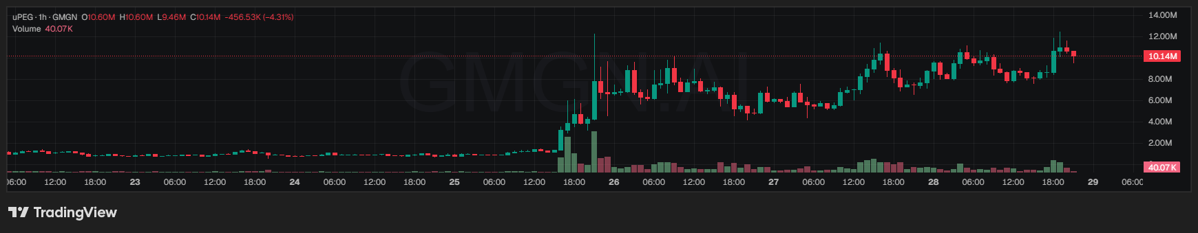 根据 GMGN 的数据,uPEG 的市值一度超过 1200 万美元,达到历史最高点 (ATH)。